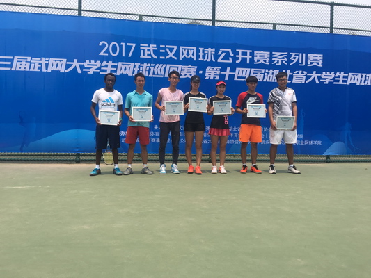 2017武汉网球公开赛系列赛•第三届武网大学生网球巡回赛•第十四届湖北省大学生网球锦标赛首站于5月20、21在武汉城市职业学院举行。此次大赛由湖北省教育厅和武汉网球公开赛组委会联合主办,涵盖了湖北省所有高校,分甲组(普通生业余组)、乙组(高水平专业组),参赛人数有两百余人。我校网球代表队选派出10名运动员分别参加男子甲组、男女乙组比赛,其中斯坦利获得男子甲组单打冠军,斯坦利、杜翔宇获得男子甲组双打冠军,姚琦、牛一帆包揽女子乙组单打冠、亚军,闵捷、谢承熹分别获得男子乙组单打第二、三名。